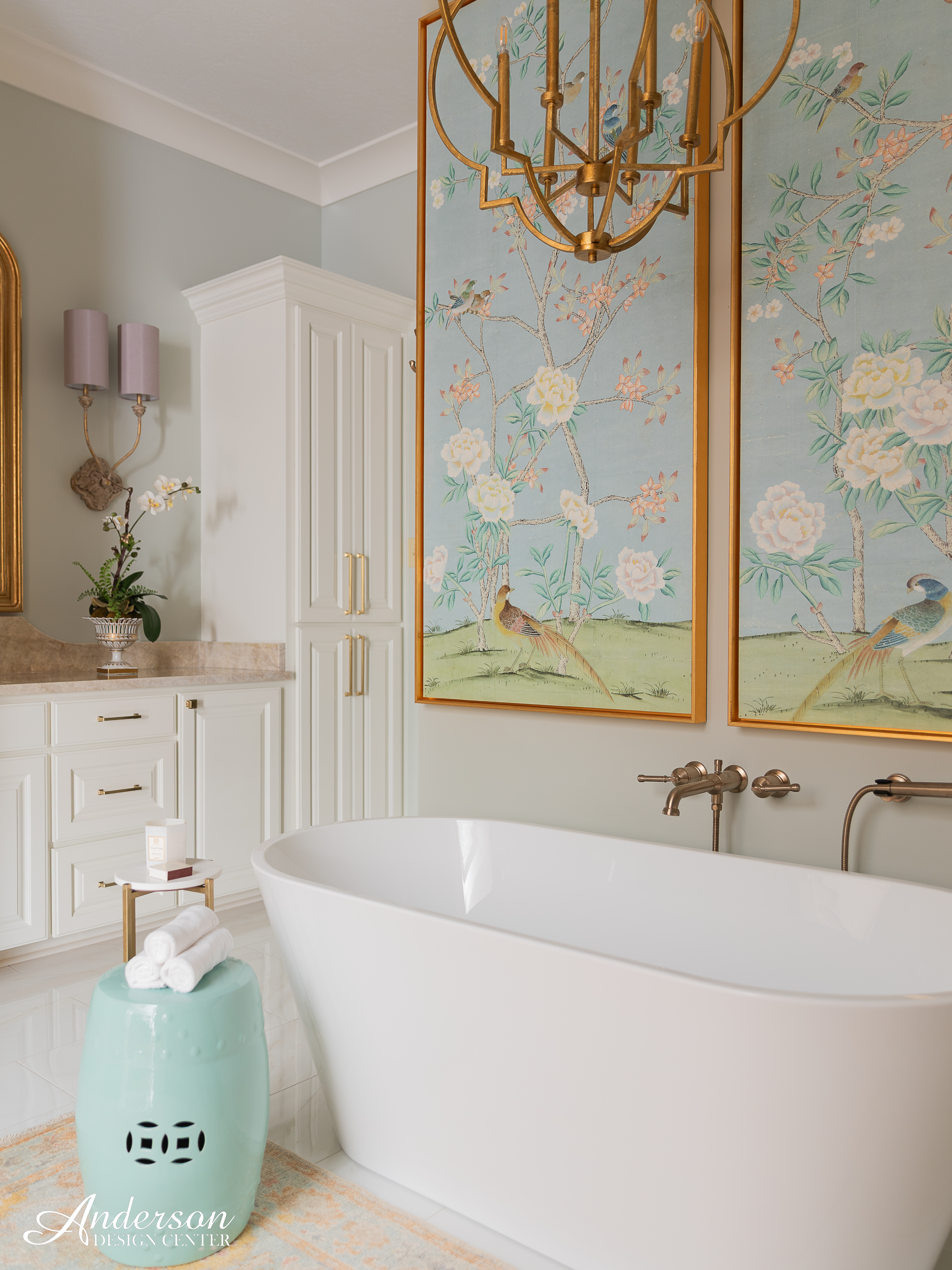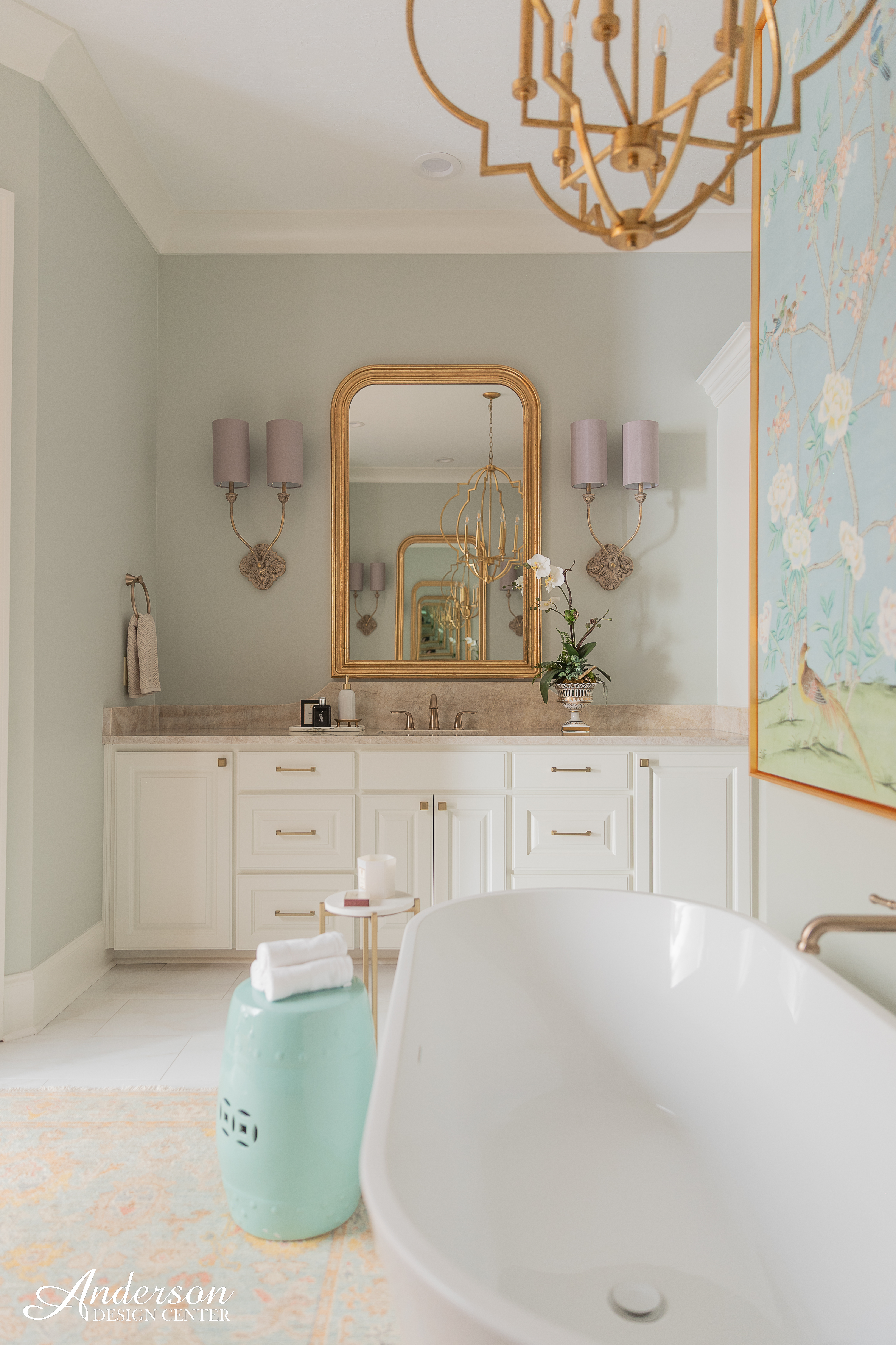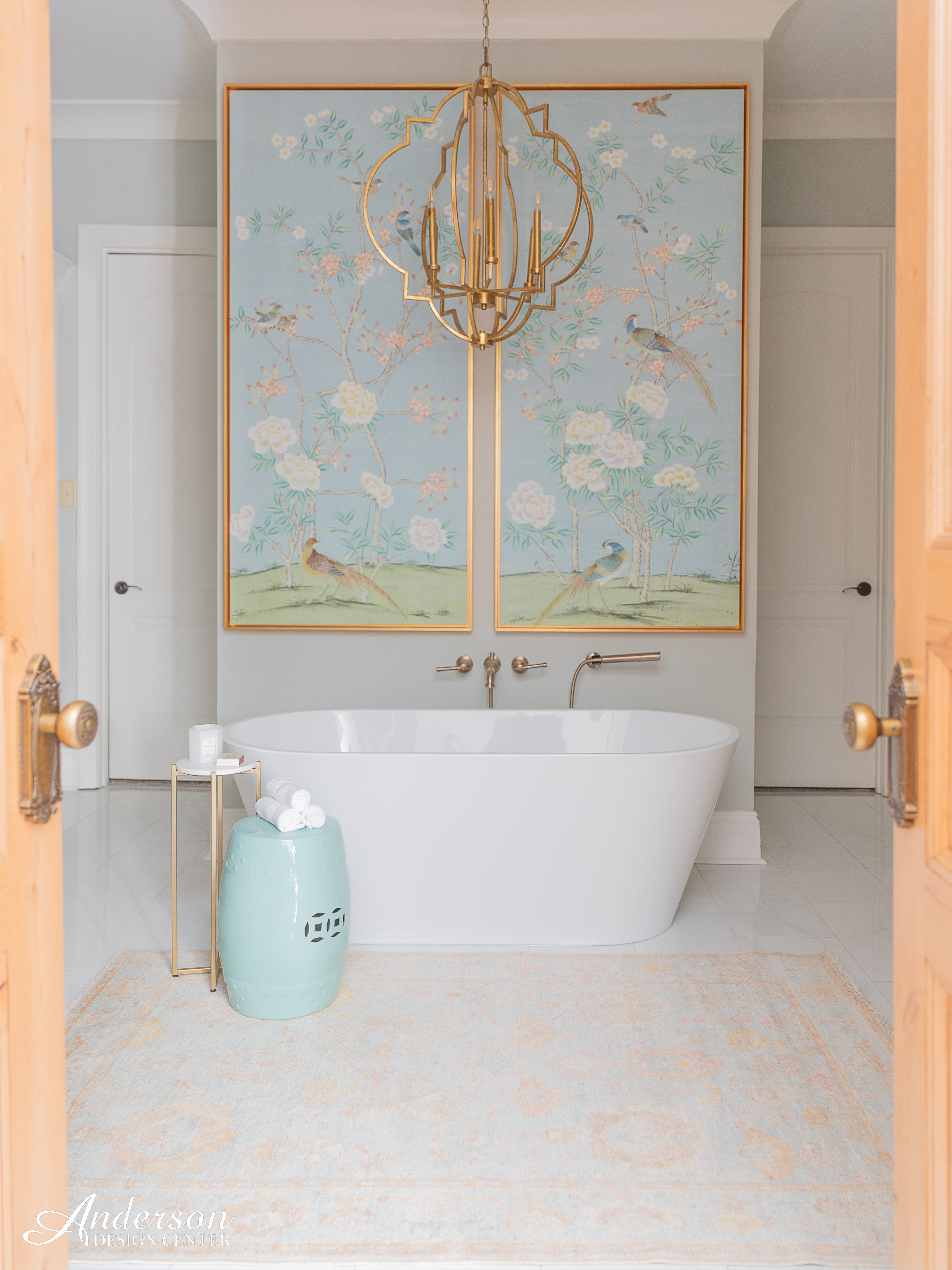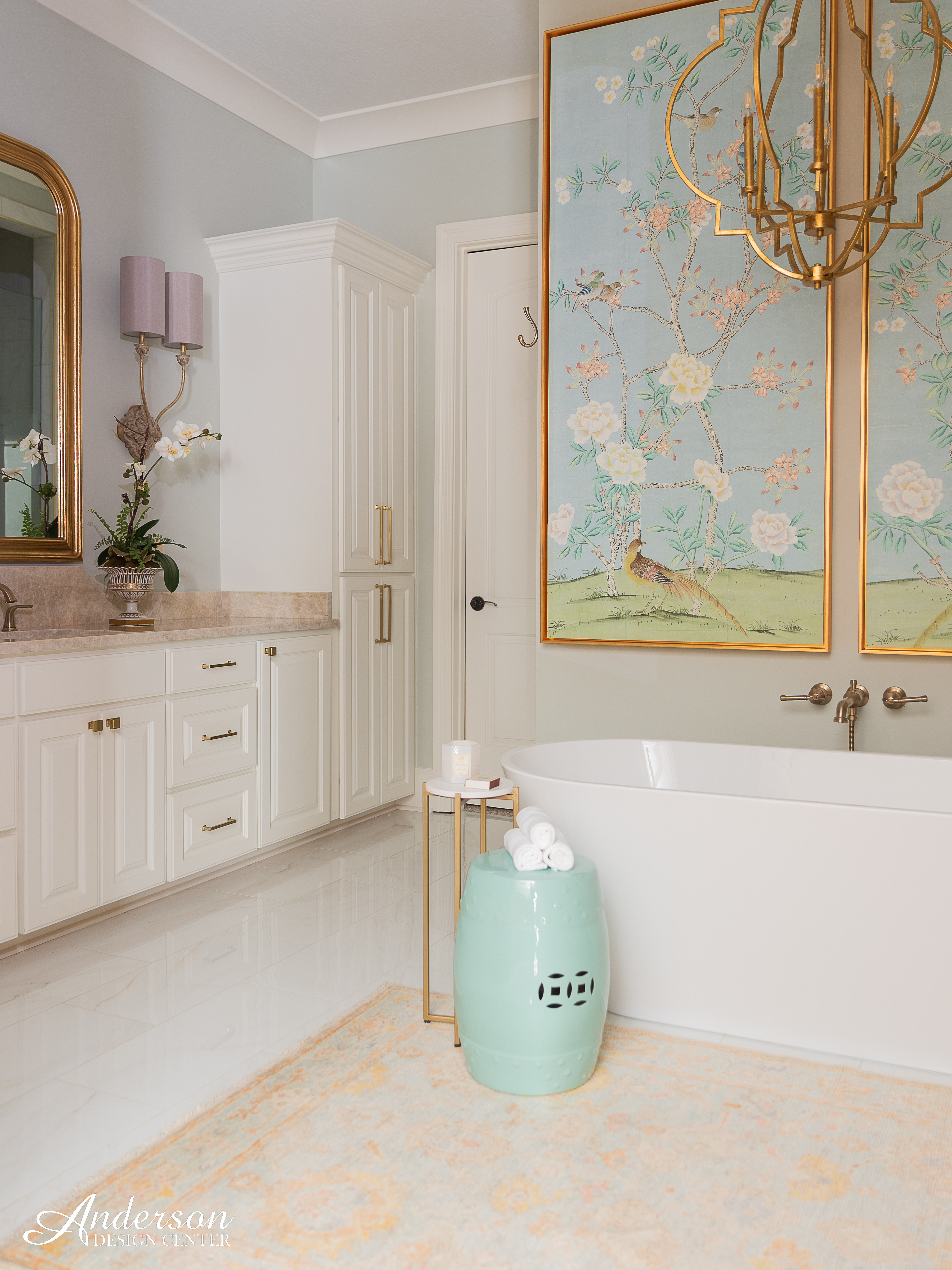 New tile floors lay a timeless foundation, complemented by freshly painted cabinetry and elegant Taj Mahal countertops that soften and elevate the space. The former deck tub was removed and replaced with a freestanding tub, creating a beautiful and intentional entry moment. Framed wallpaper panels now hang just above the tub, adding a statement detail that immediately draws the eye and sets the tone from the moment you walk in.