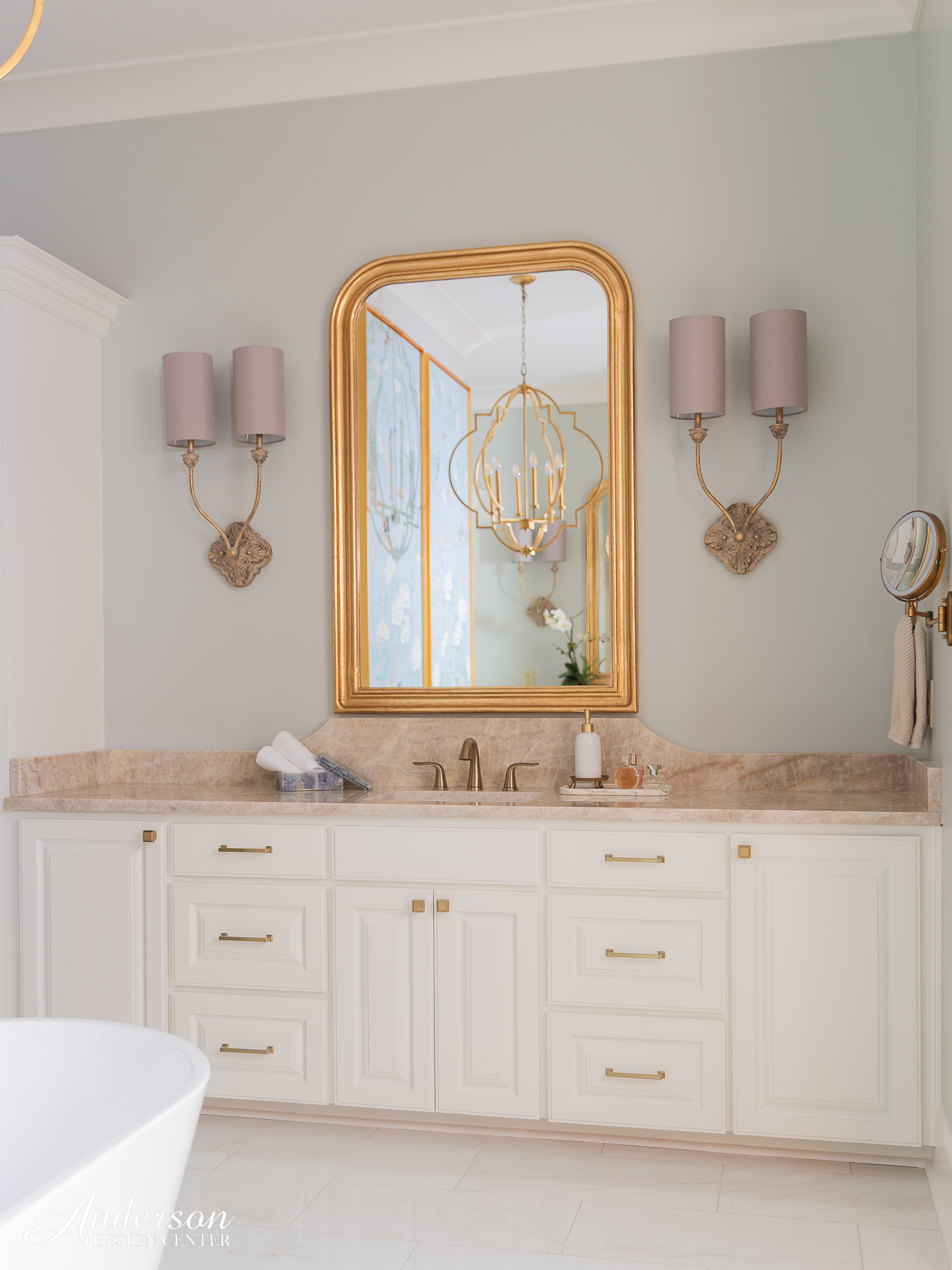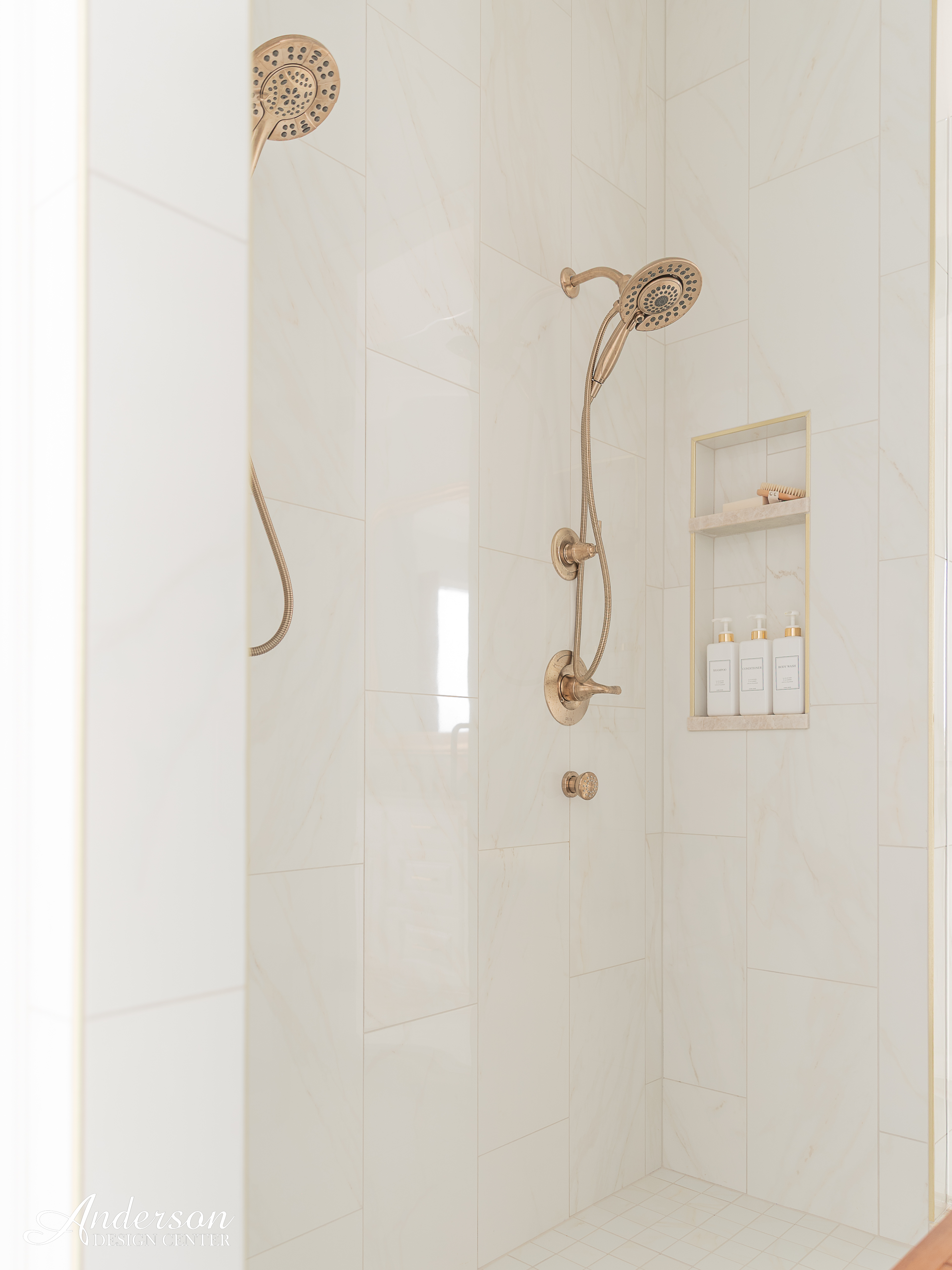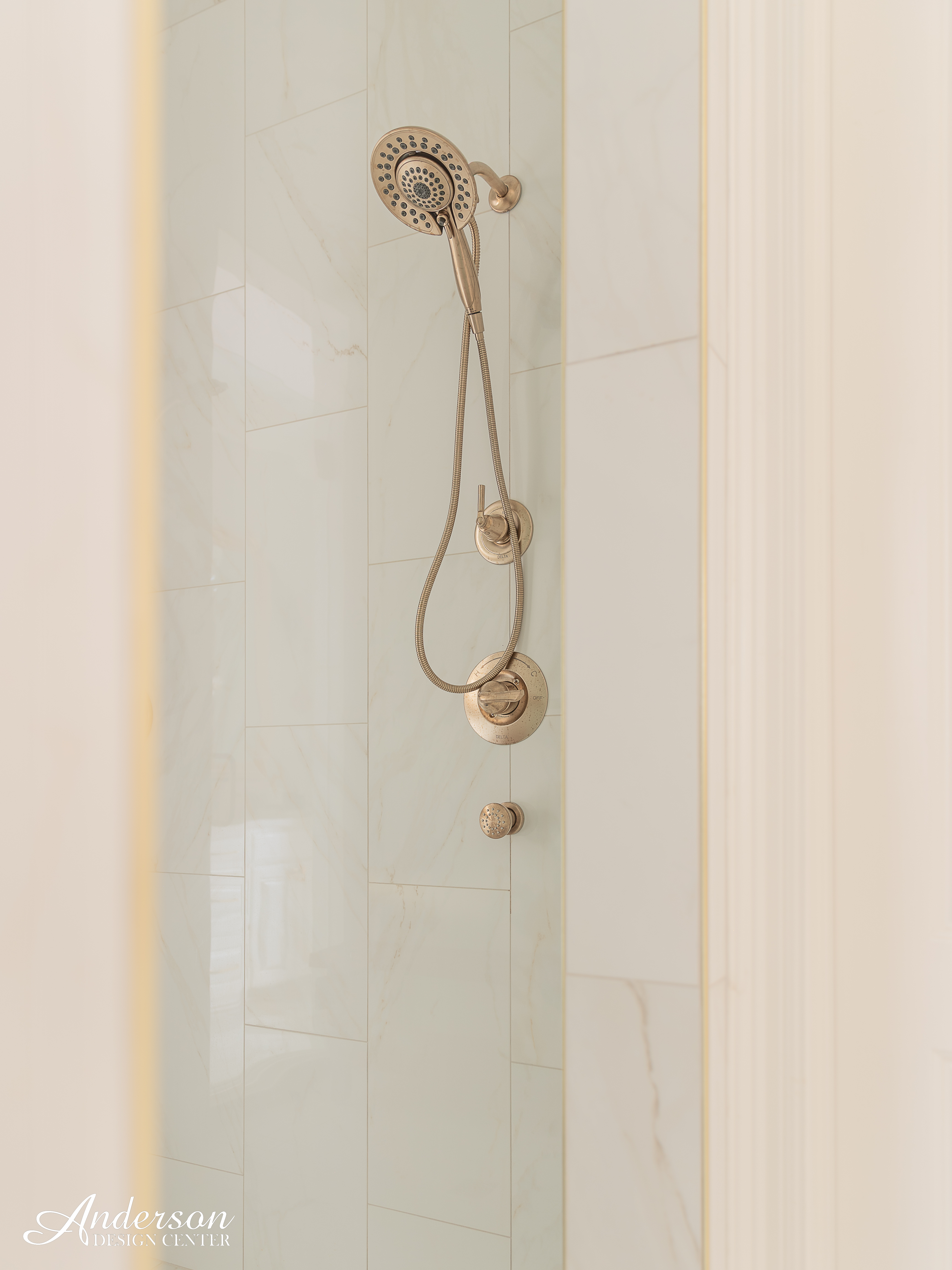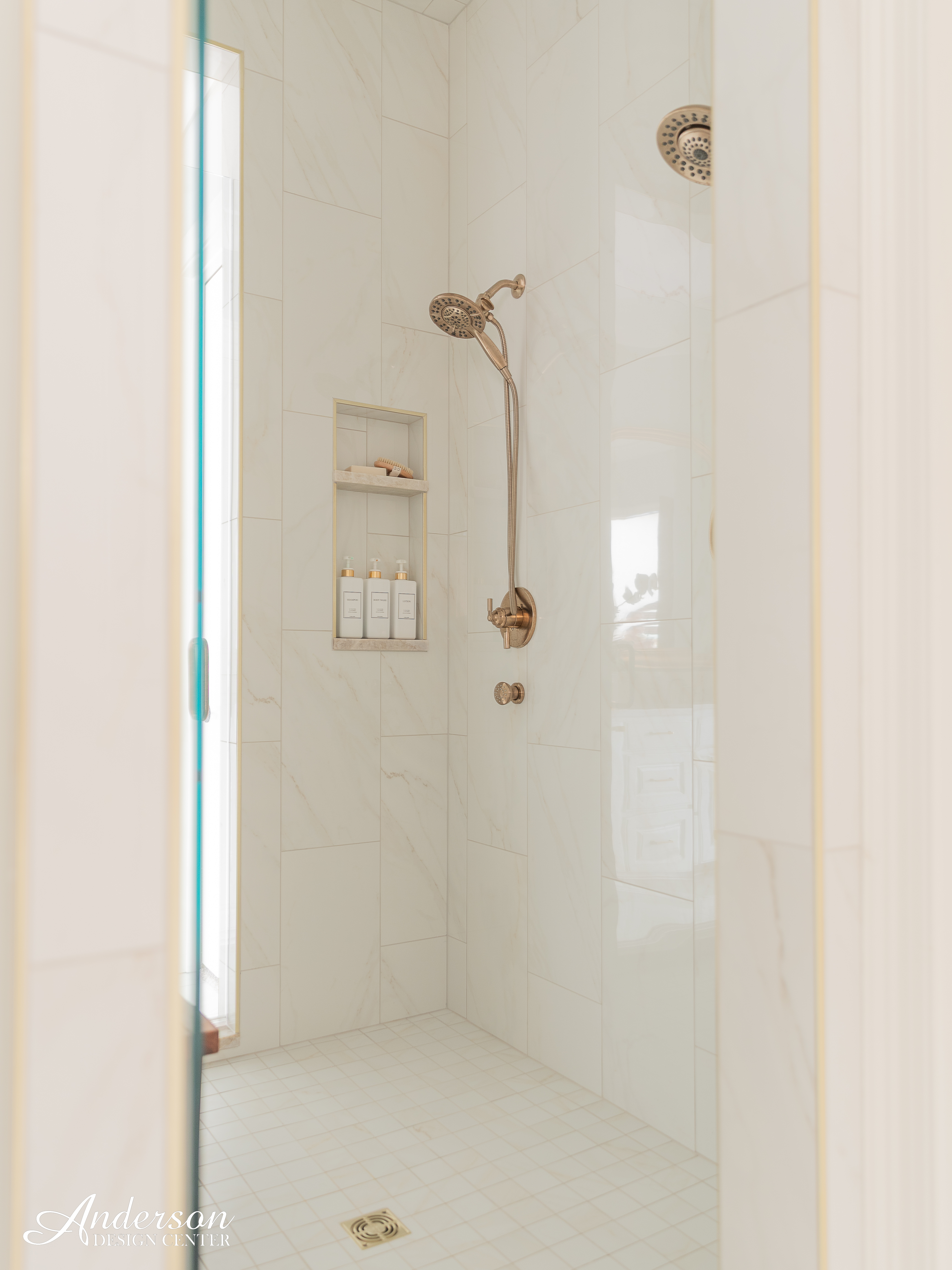A once-dated primary bathroom was thoughtfully transformed without altering the original footprint, proving that impactful design doesn’t always require moving walls.